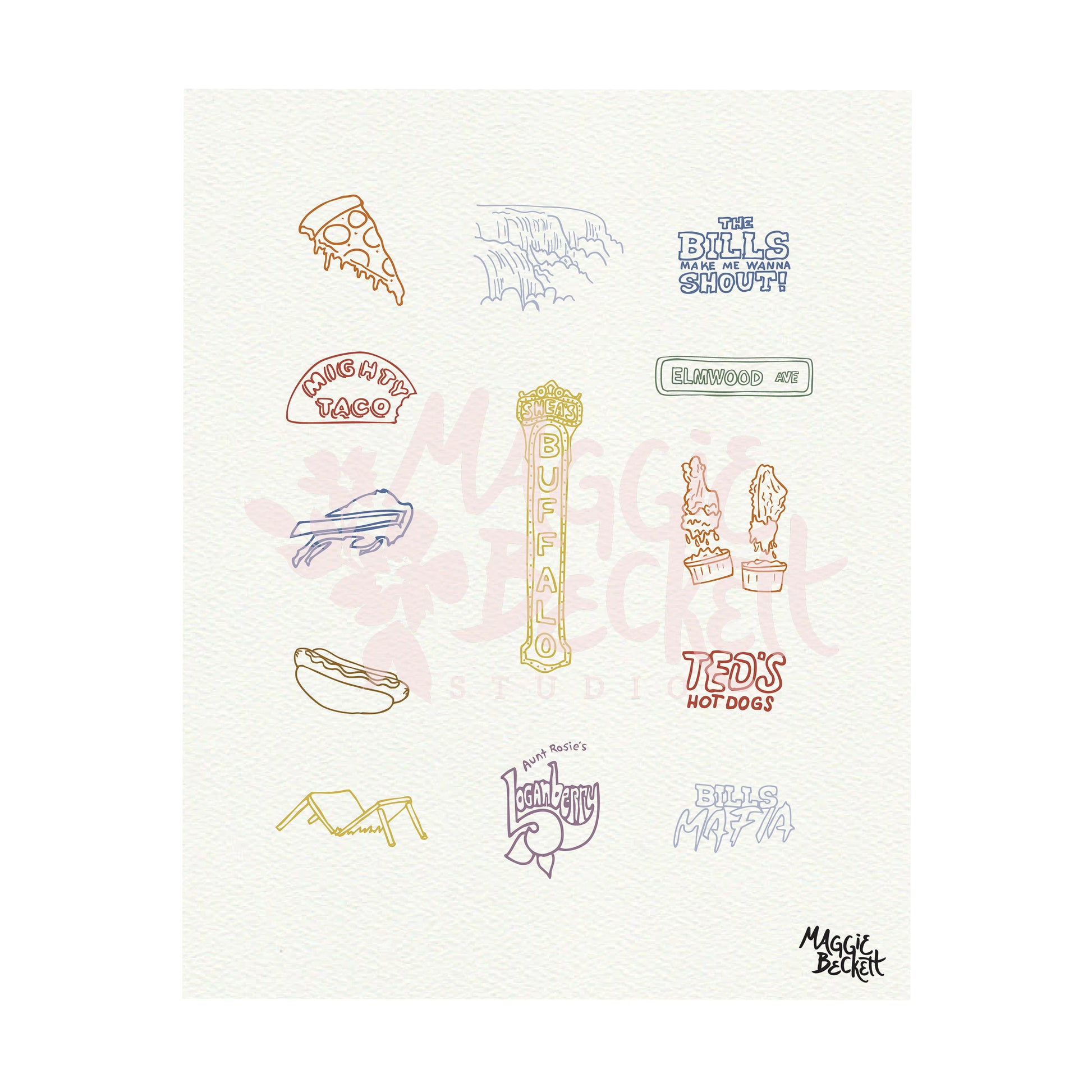 Hand drawn Buffalo, NY icons artwork, recreated as a print on Epson Somerset Velvet certified archival paper. Print only- frame is not included.