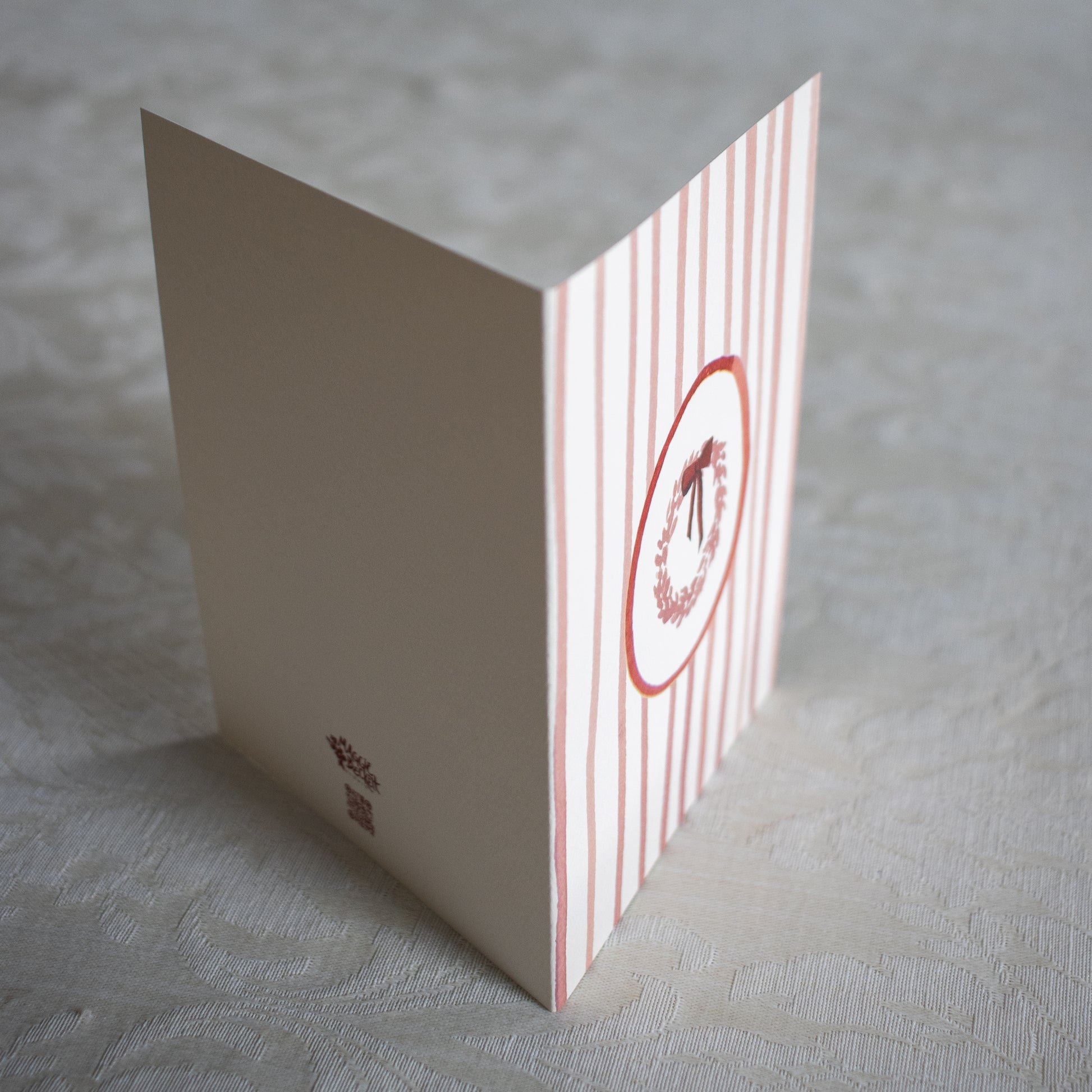 Pink wreath and matching stripe artwork printed on 110lb textured warm white paper with a high quality, watercolor paper feel.